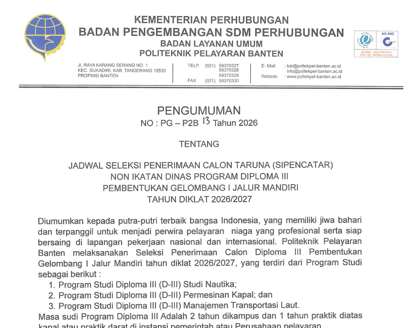 Berikut disampaikan Pengumuman Jadwal Sipencatar Non Ikatan Dinas Program Diploma III Pembentukan Gelombang 1 Jalur Mandiri Tahun Diklat 2026/2027