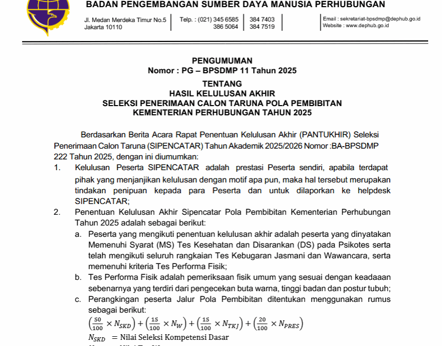 Pengumuman Tentang Hasil Kelulusan Akhir Seleksi Penerimaan Calon Taruna Pola Pembibitan Kementerian Perhubungan Tahun 2025
